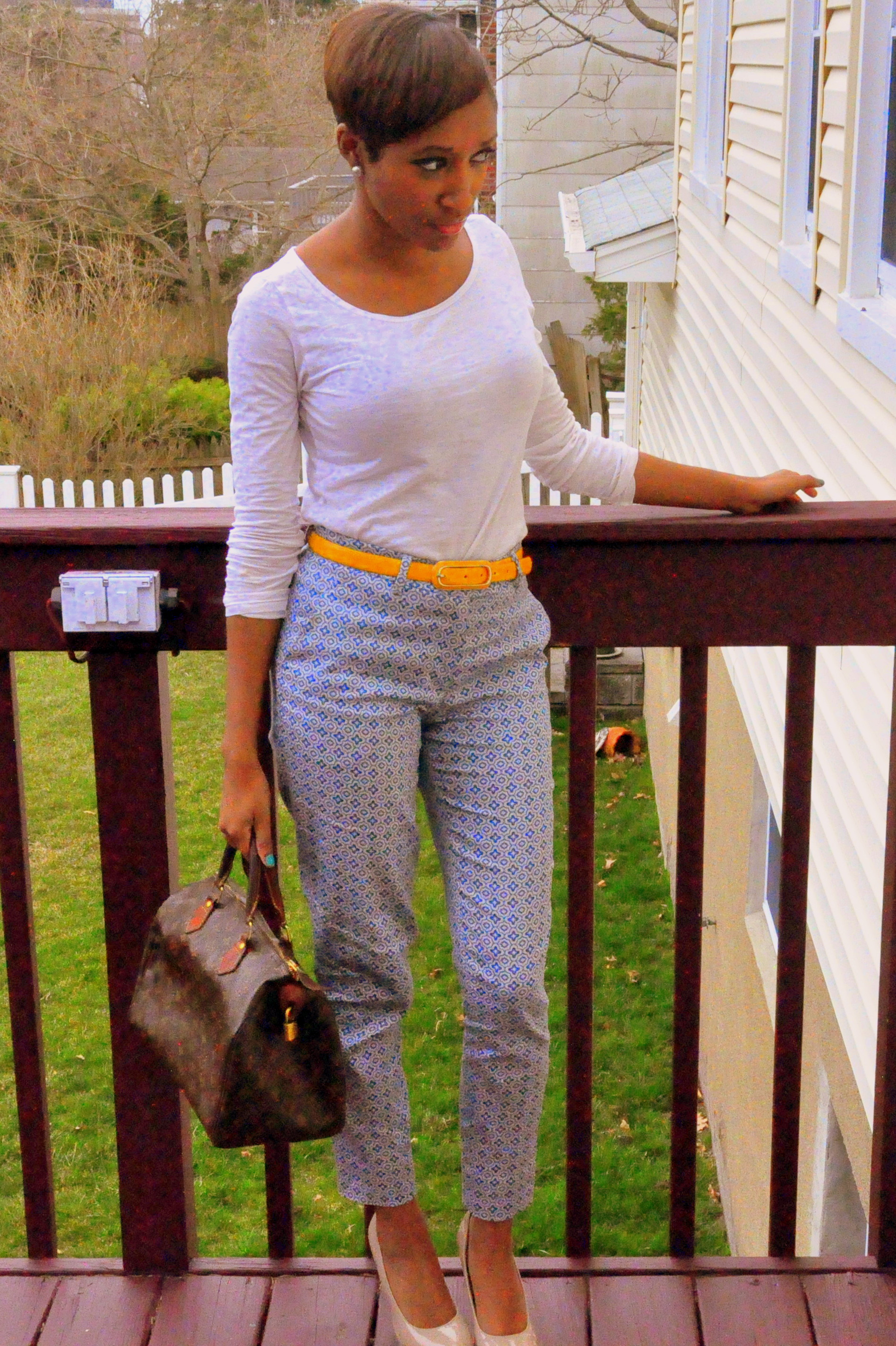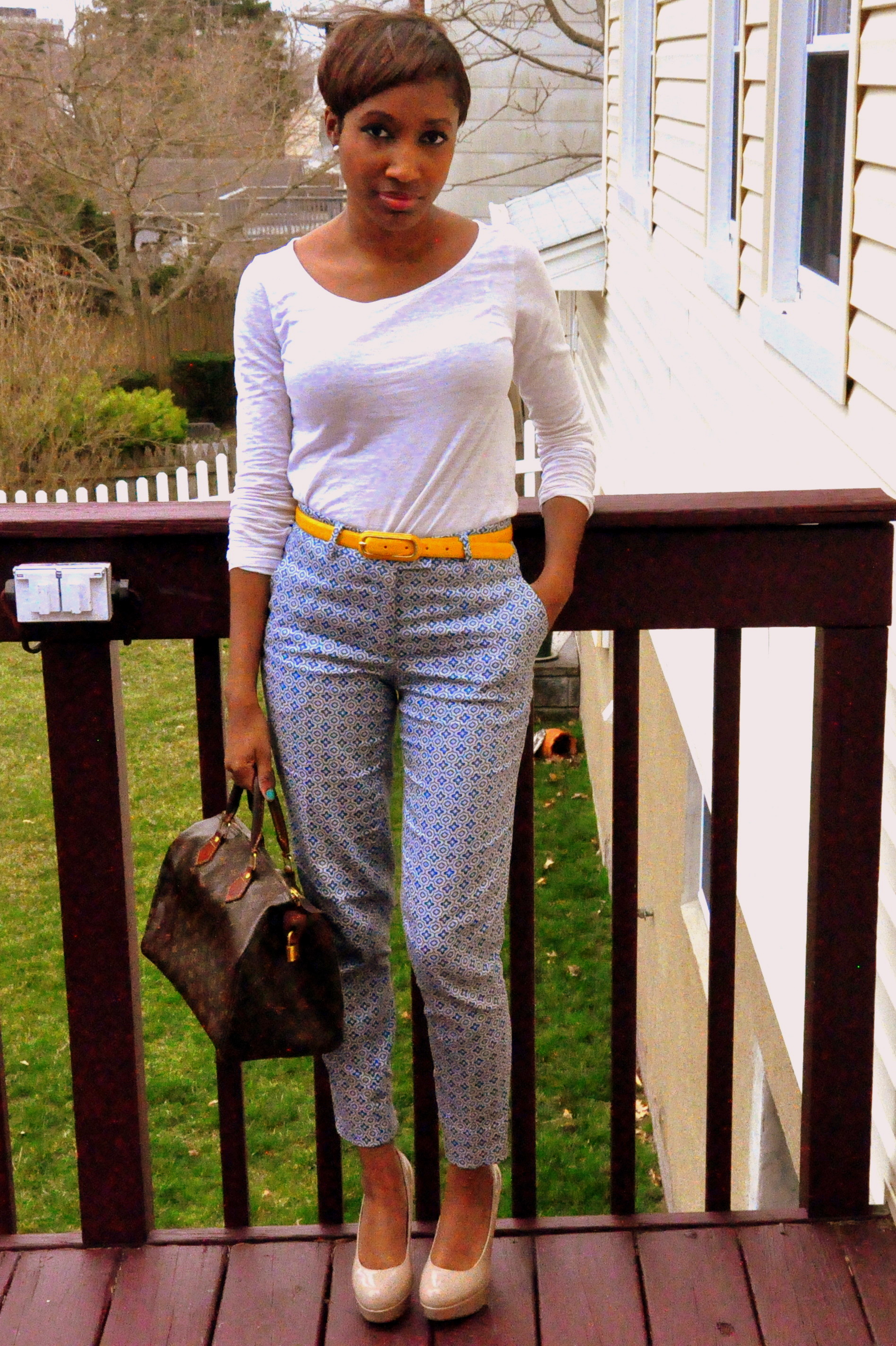 Happy Easter everyone! Today I decided to wear blue geometric print pants, a basic white long sleeve top, and nude pumps. I accessorized with bright yellow belt and my speedy bag. I opted for pants instead a dress because it is not quite warm enough to go without tights, but I still wanted to be able bright spring colors. Check out how to achieve a similar look below!