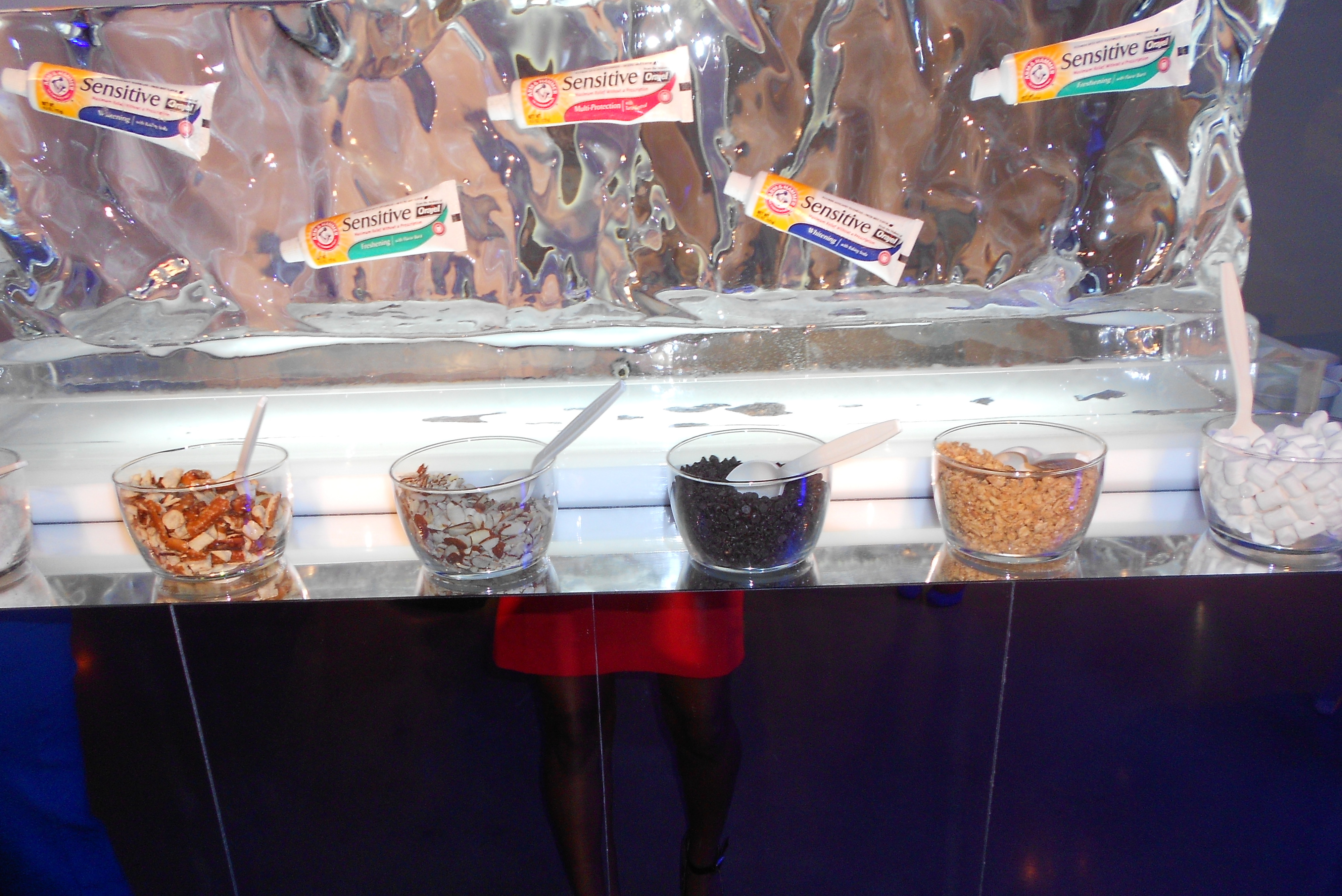 The cold side of the room offered frozen treats from Chloe’s Soft Serve Fruit Co. The topping bar allowed you to go as crazy as you want to. I also could not help but admire the ice sculpture with tubes of Arm & Hammer Toothpaste frozen into it!