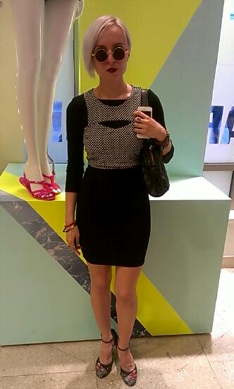 Yesterday, I popped into the newly renovated Forever 21 in Herald Square. I spotted Yekaterina standing near the entrance. I loved her mixed print combination of floral and geometric with her dress and pumps. Her chic platinum blonde bob, dark red lipstick, and round sunnies pulled the look together. I always have respect for effortless style and Yekaterina had just that!