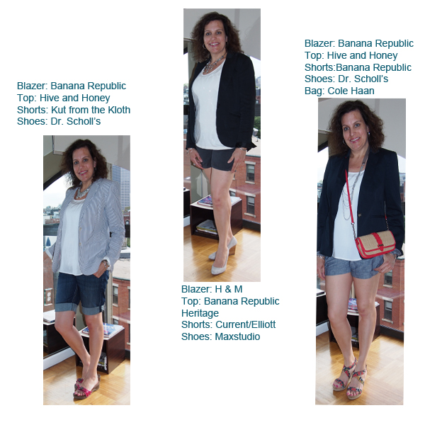 When putting together your outfits choose a pair of your favorite shorts or shop for a new pair. I found a lot of fun shorts while shopping online, my two favorites were from Joefresh. Any style will work with a basic blazer. I found a couple of nice blazers on sale at Nordstrom. Add accessories and shoes based on the look you want: preppy, casual, dressy, etc.