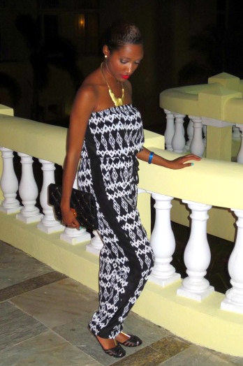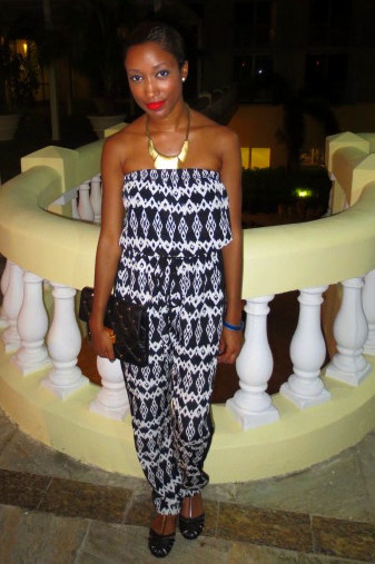 Happy Monday! Last night for dinner, I wore a monochrome tribal print jumpsuit. I accessorized with my studded Michael Kors clutch and wore red lipstick for a a pop of color. When I was buying this jumpsuit, the thing that drew me to it was not only the print, but the tuxedo stripes on the side as well. Sometimes it is those small details that influence a purchase one way or the other for me. Check out some detail shots of my look below!