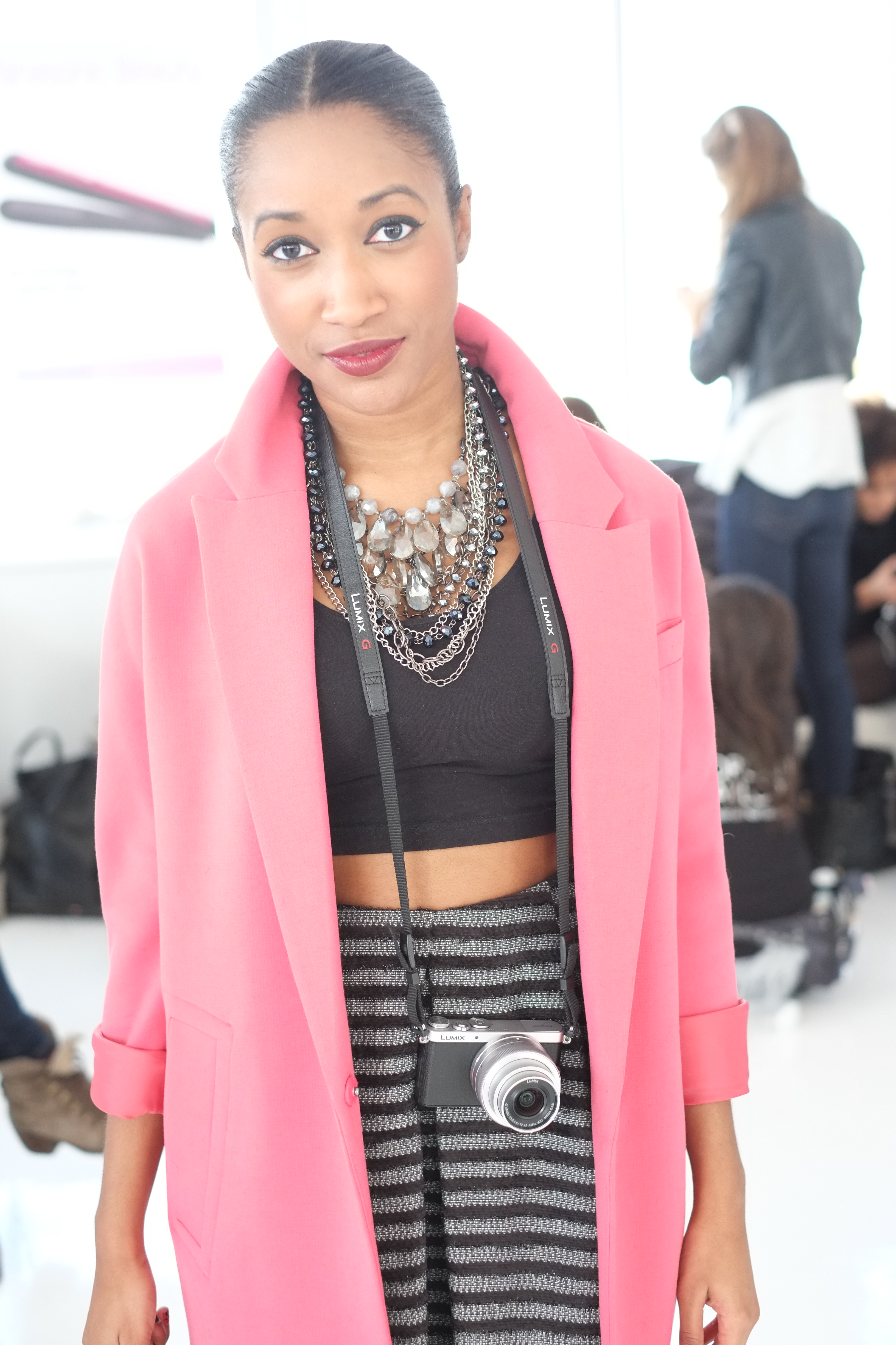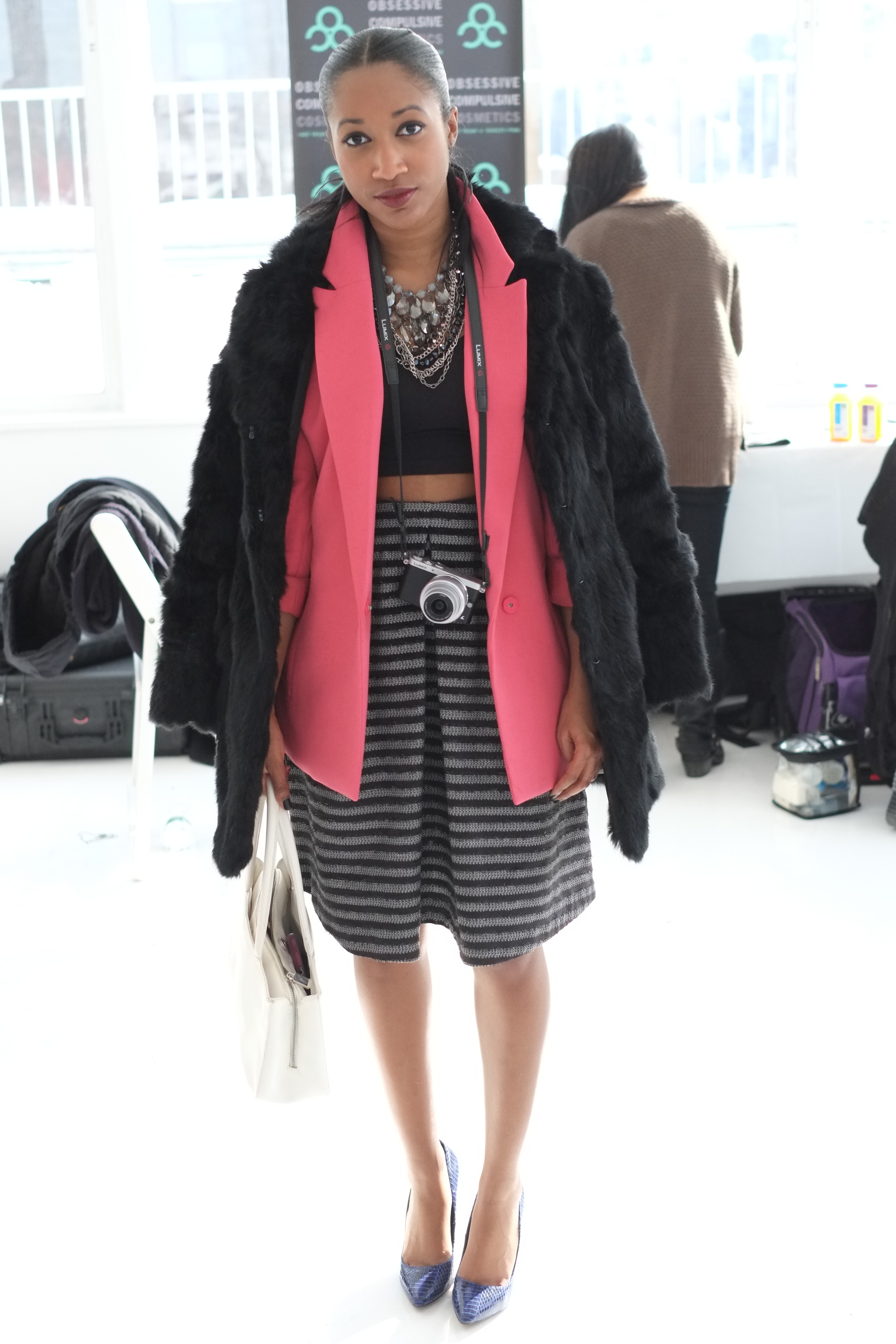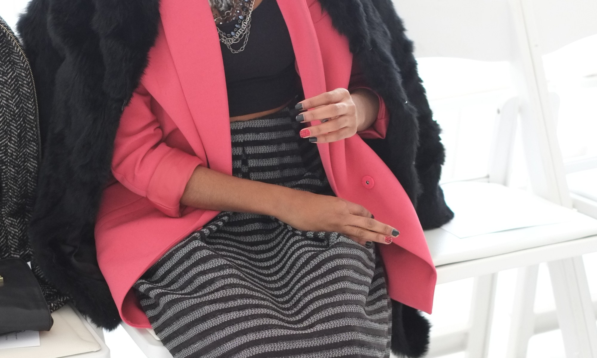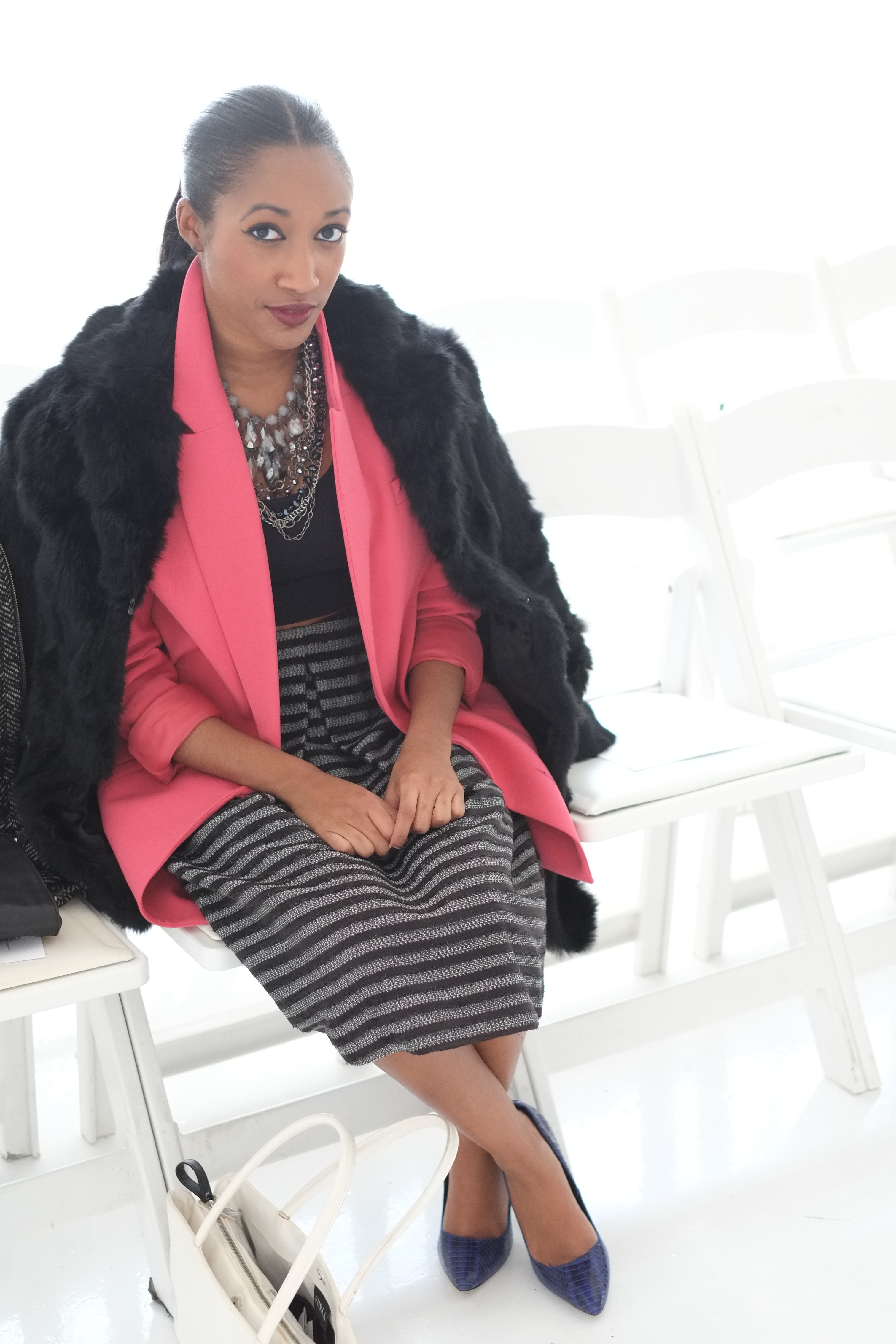 Yesterday, I got the opportunity to attend two shows during Day 4 of New York Fashion Week! I wore an oversized salmon colored blazer with a crop top and metallic striped full skirt. I completed the look with my fur coat and cobalt blue python pointed pumps.