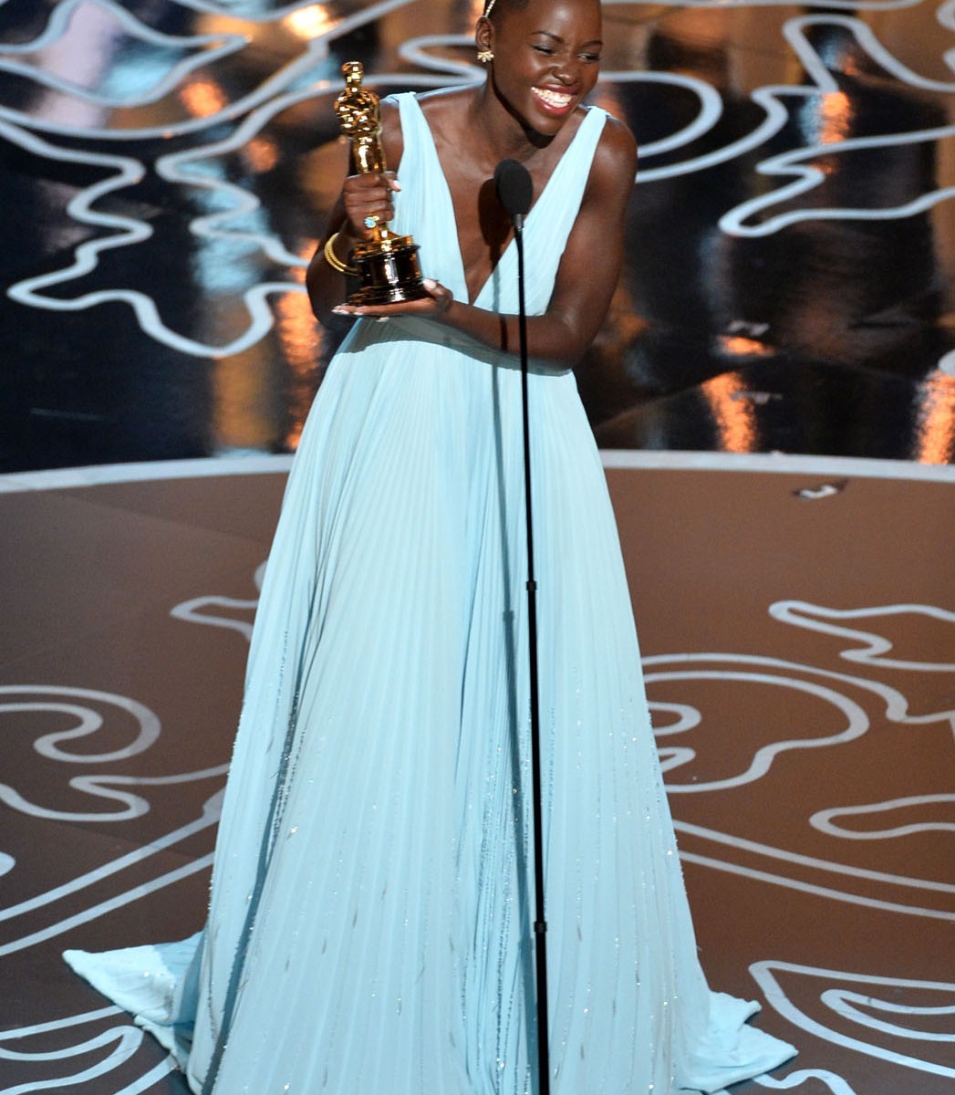 It may have been the color (self described as Nairobi blue). It could have been the plunging neckline. It may have been the ethereal flowing bodice. It could have simply been the natural happy glow that exudes off of her. Whatever it was; the Oscar winner for best supporting actress, Lupita Nyong’o, was clearly the biggest winner of the night.