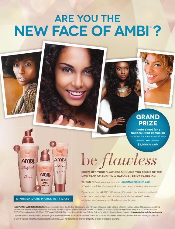 AMBI® Skincare, a long time trusted line of moisturizers and cleansers for skin of color, has announced its first ever model search. The brand is looking for women ages 18 and older who can embody what AMBI® represents. The Grand Prize Winner will be featured in a national print campaign, receiving a 3 day/2 night trip to New York City for a professional photo shoot plus $2,000 cash!