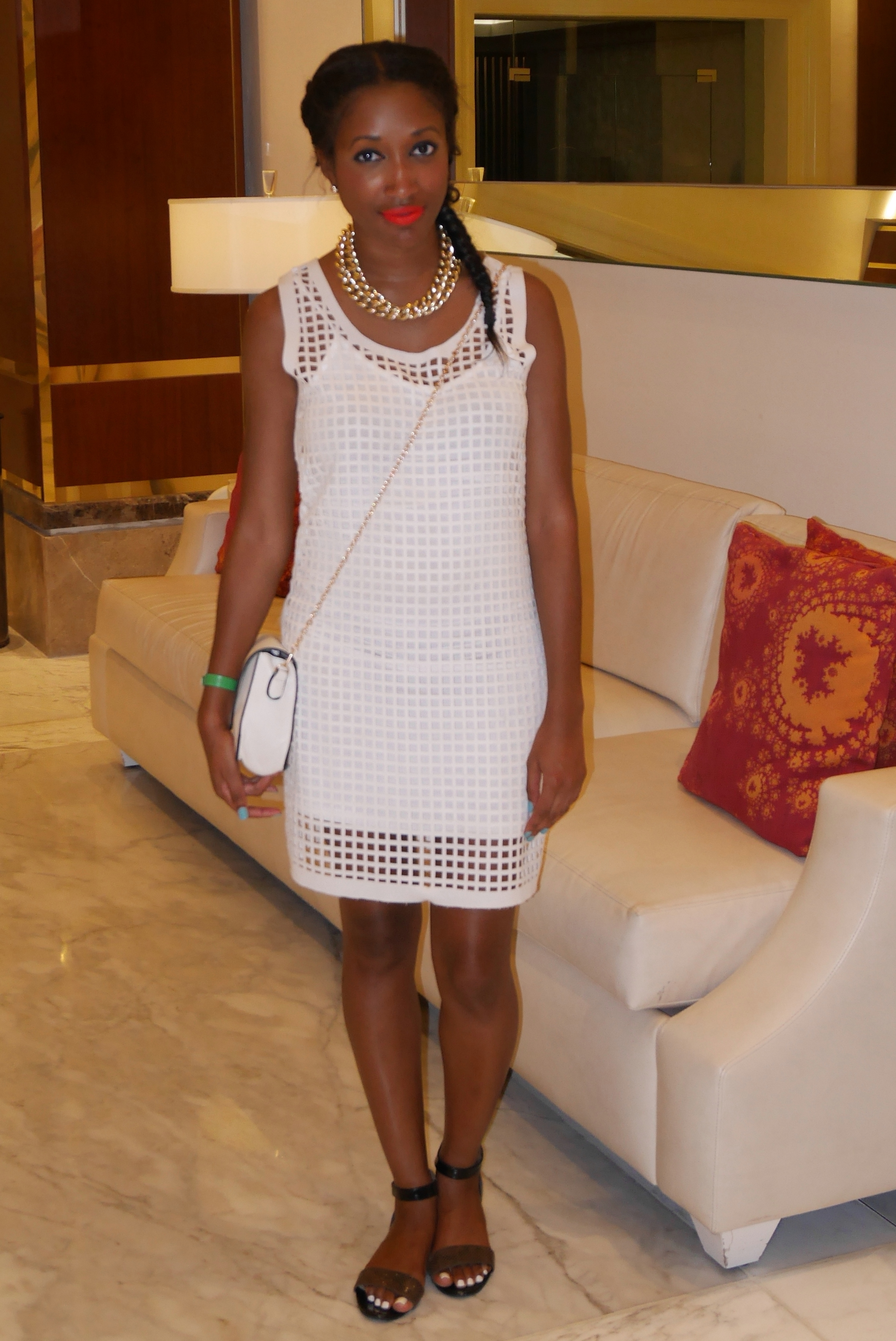 On Day 4, we went to dinner at a surprisingly good hibachi restaurant on the resort. I wore white laser cut shift dress with my white cross-body bag. I broke up the white with a pop of orange lipstick and a pair of neutral sandals.