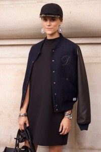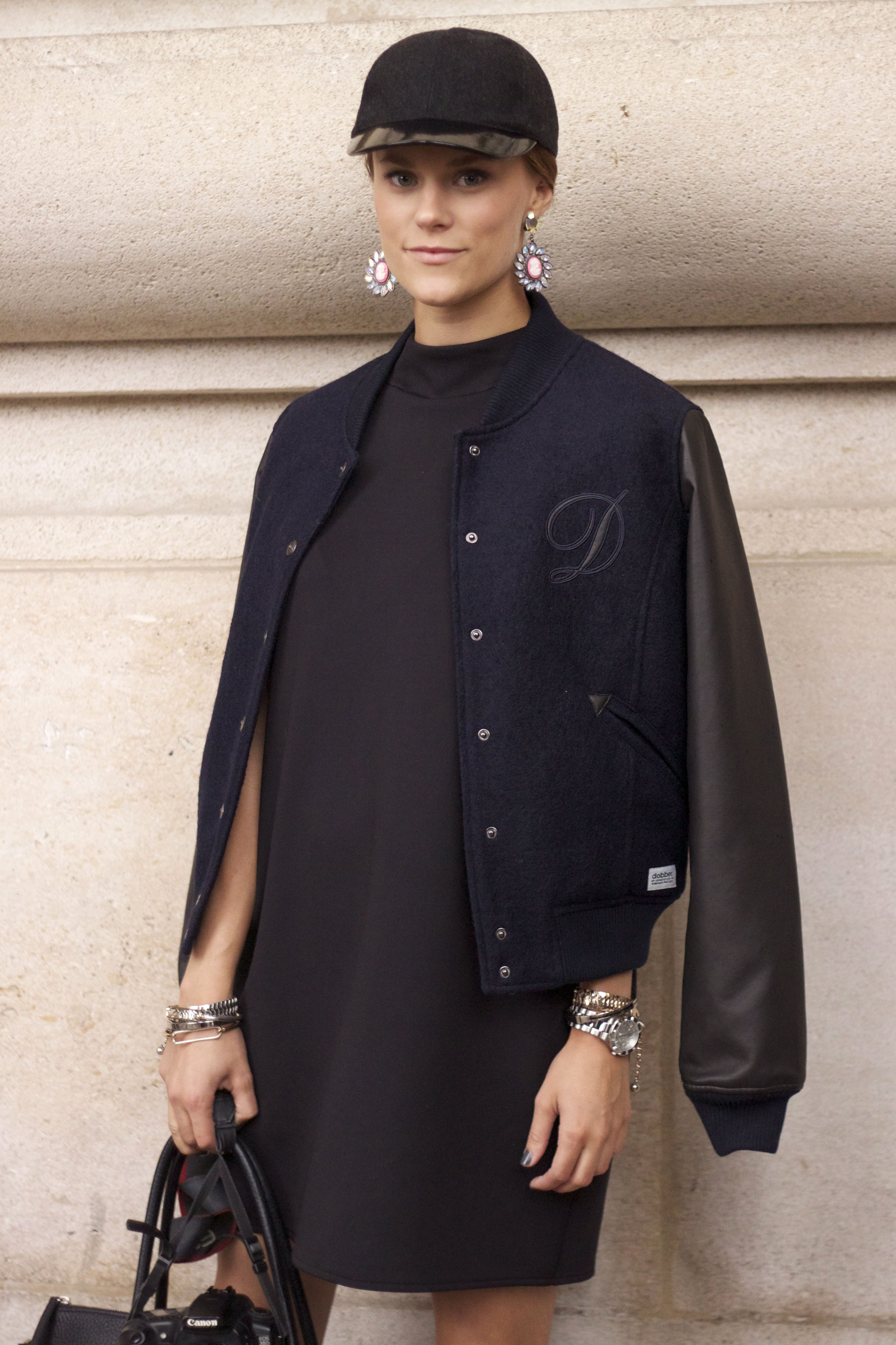 Woman in a cap and varsity jacket at Paris Fashion Week