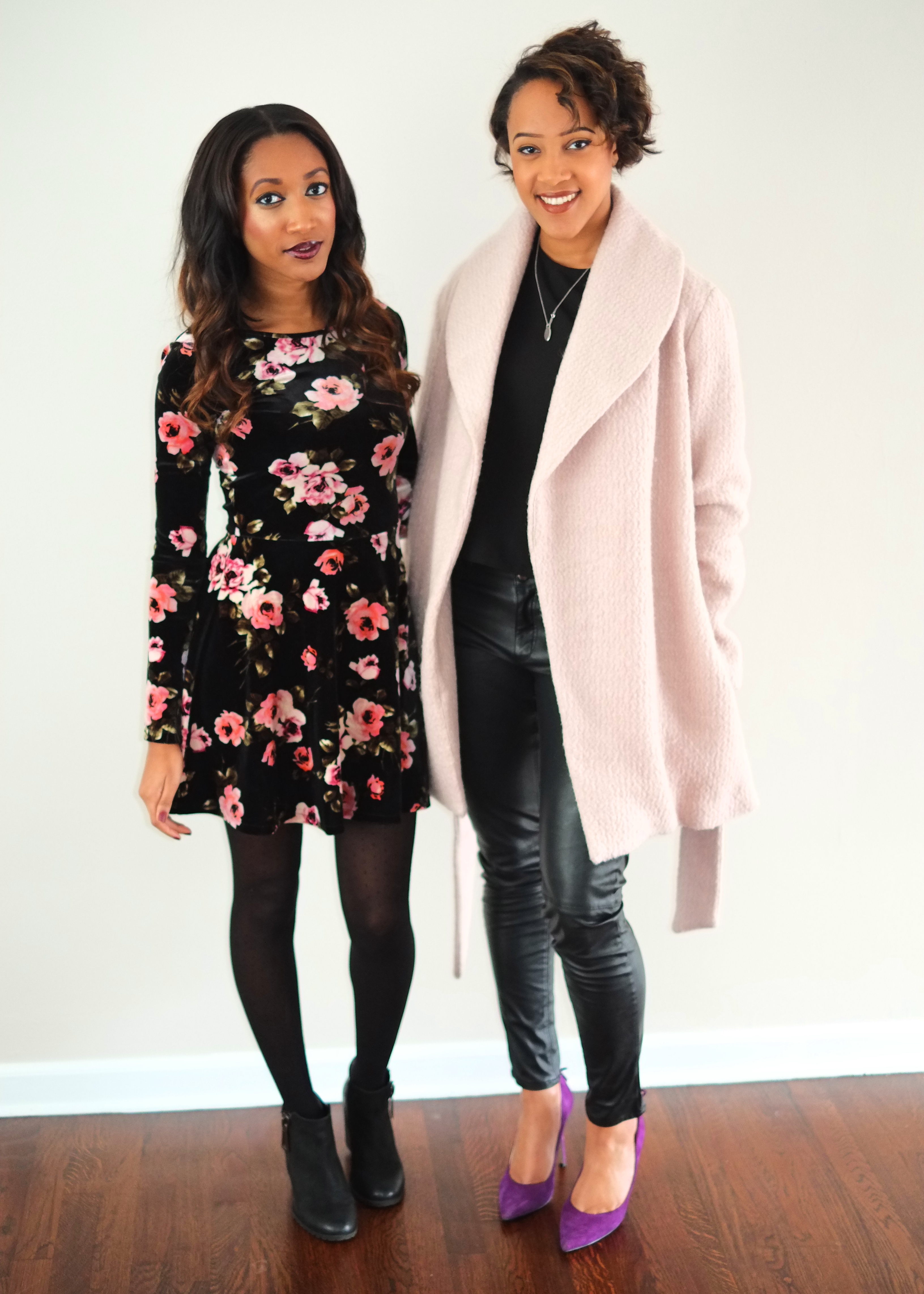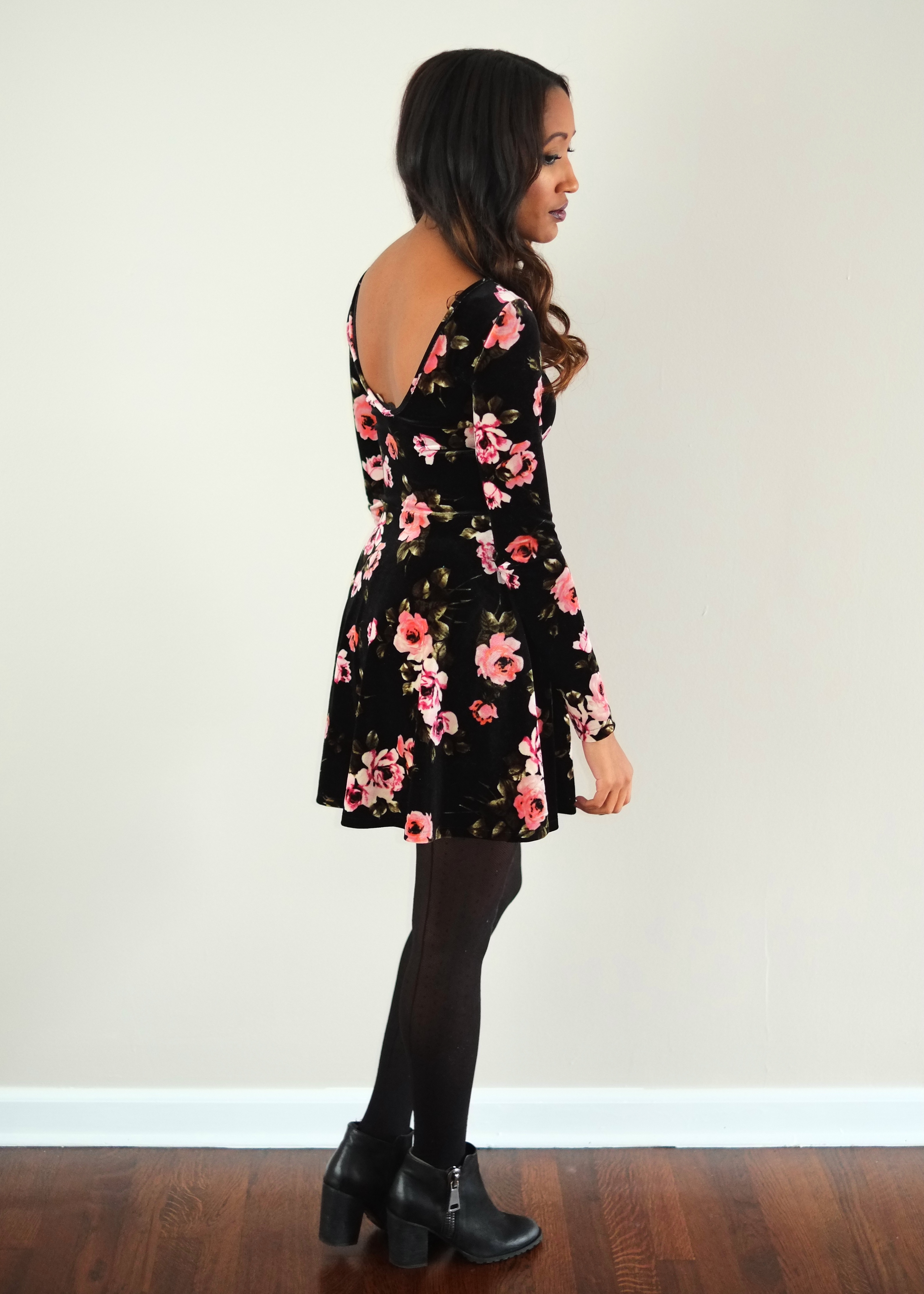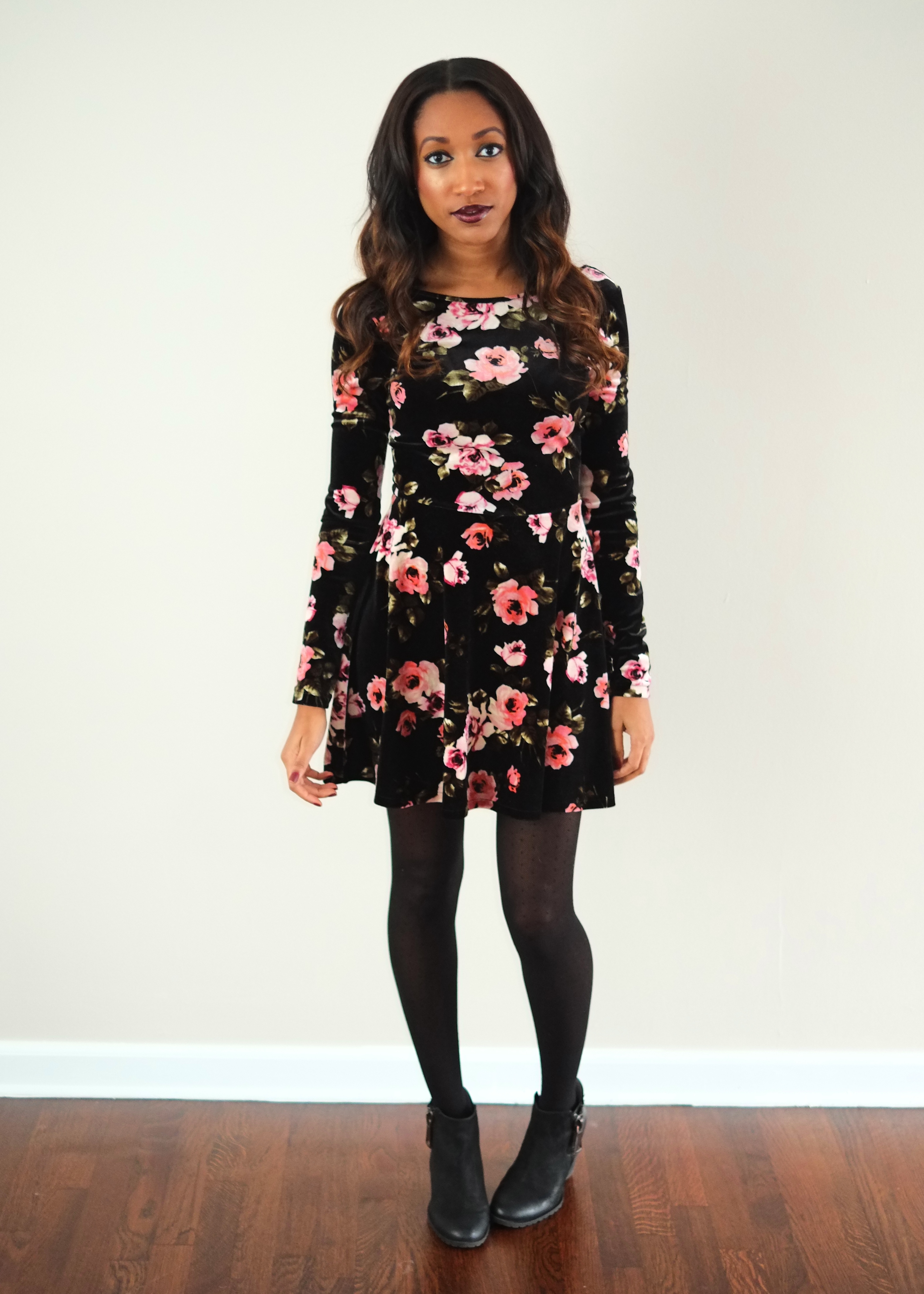 Hope everyone has an amazing Thanksgiving with your families! Yesterday I wore floral velvet dress courtesy of Aeropostale (sold out—similar dress) with polka dot tights and booties. I toughened up the look with some vampy lips.