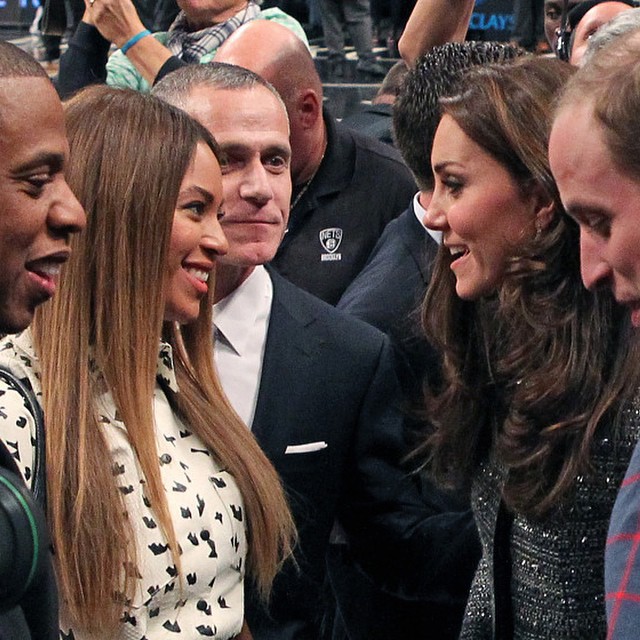 Queen Bey and Hov just got up and strutted over to the royals like they owned the place. Well actually, Jay Z sort of did own the place. They met Will and Kate at the Nets-Cavaliers game that took place at the Barclays Center (which Jay Z was a partial owner of until Sept 2013 when he sold his stakes for the arena and the Brooklyn Nets).