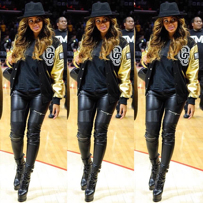 Beyoncé took in a basketball game with hubby Jay Z. She wore a gold-sleeved varsity jacket, a plain black tee, rocker chic leather pants, platform booties, and topped it off with a fedora. This look is so on trend and the perfect balance of casual and fabulous.