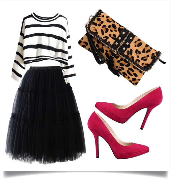 Tulle Skirt Stripes Stripes are the perfect combination with a tulle skirt. A leopard clutch is a fun way to mix prints.
