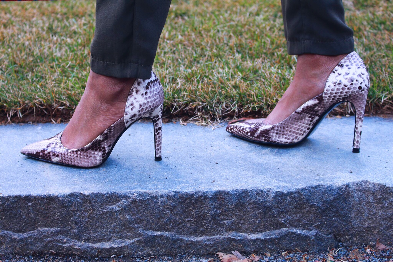An animal or geometric print shoe will make your outfit look a bit more trendy. You could be in a basic white button up tucked into a pencil skirt. When you throw on a pair of snakeskin shoes your outfit you will go from boring to fashionista.