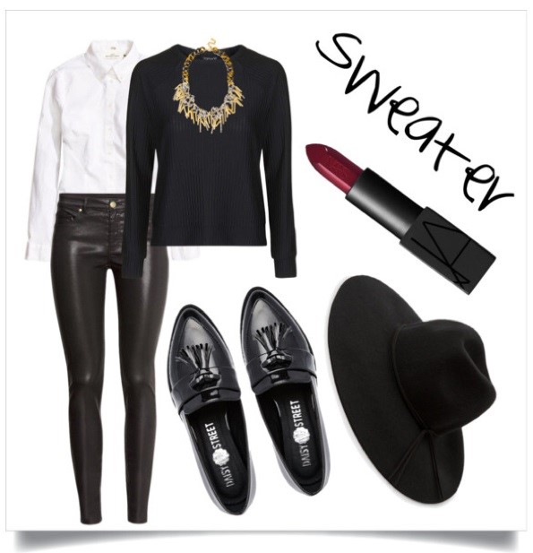 White Button Down-Sweater Get city fabulous in a pair of leather pants, penny loafers, and a fedora. It will add a bit of edge to your layered look!