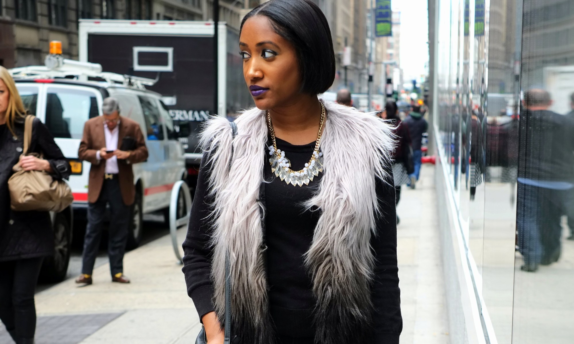 Now the fur vest started out with a super chic bang, but like all trends trickled down to affordable stores and into basic land. I mean how many girls have you seen in riding boots, a chunky sweater, a fur vest, dark blue skinny jeans, and a PSL in tow. They’re probably doing a fall activity like pumpkin picking or jumping in leaves while they laugh uncontrollably for that perfect “candid” shot. They’re also, unfortunately, just a wee bit basic. Le sigh.