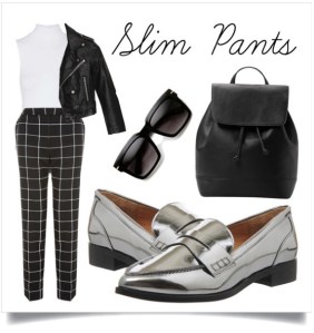 Go for cool updated 60's look with a pair of slim cut pants and loafers. Metallic loafers will add a real pop. Note: This can be alternated with a skinny pairs of jeans!