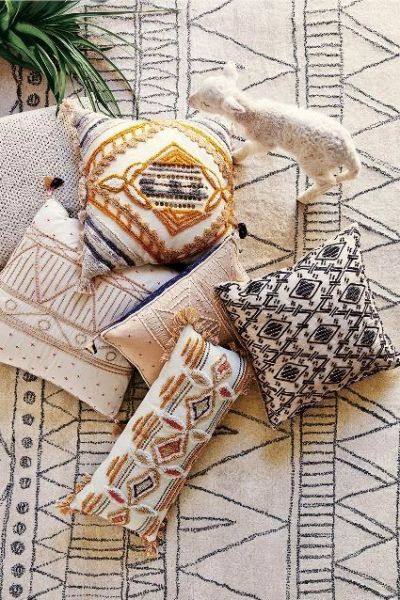 The pillow pictured may be on the earthy tones side, but they’re great for introducing texture and pattern. Mixing it in with some brightly colored pillows can be fun and add interest.