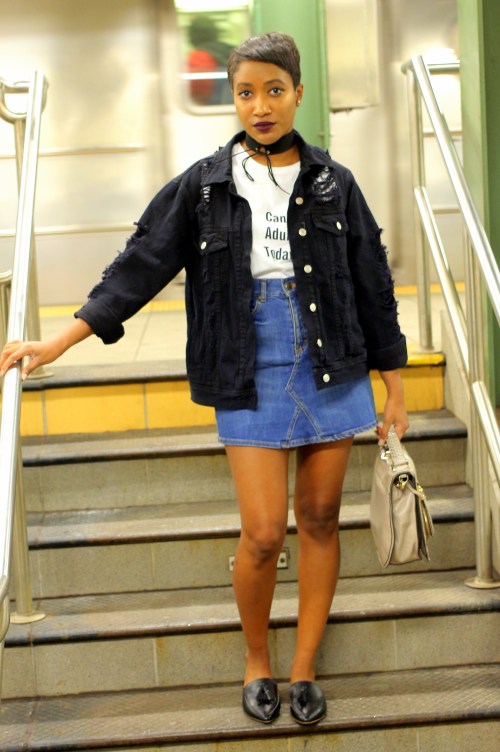 Jacket: Tobi | Shirt: Zazzle | Skirt: Zara | Bag:Rebecca Minkoff | Mules: JustFab