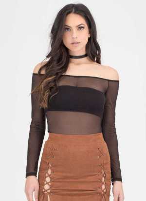 Stretchy, lightweight, long-sleeved bodysuit that features sheer mesh throughout AND an off-the-shoulder neckline?! This is just screaming a good time.