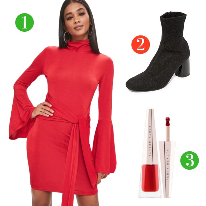 It’s the holidays so you can never go wrong with a little red dress. Finish off this look with a pair of glitter sock booties and a red lip. Throw on some fishnet tights if it will be a little chilly. Mrs. Claus vibes never hurt nobody!