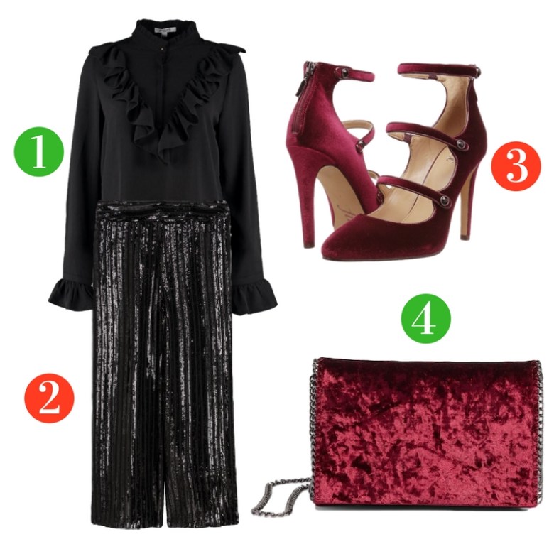 Get a little formal with your holiday wear this season! Throw on some metallic shoes that match its buttons to really pack a punch with this look. Use the red lip mentioned in the look above to bring in some holiday cheer.
