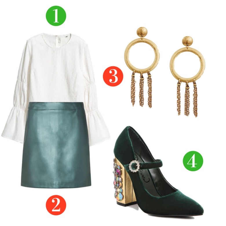 Try mixing different shades of green for another approach to festive. You could do this with just two items or go big and wear all green. Try wearing flesh tone tights so that the green can really pop off your complexion.