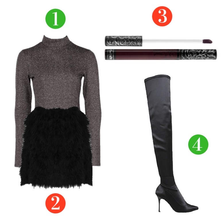 If you are looking to really make a statement, try a feather skirt! It is bold and has the added benefit of being super fun to wear. Pair with a turtleneck bodysuit and satin over the knee boots. Complete the look with a vampy lip.